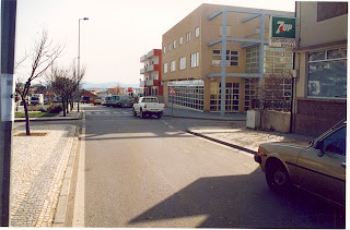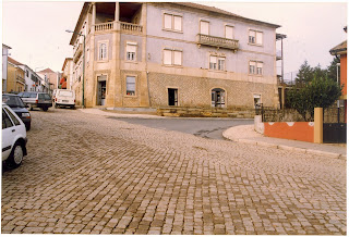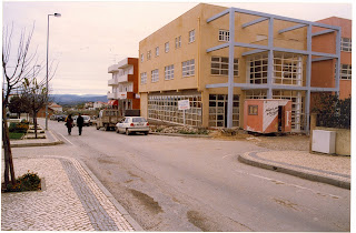 | À Esquerda:- Pré-fabricado da Caixa e à Direita a Casa da Cultura A estrada não existia tinha um muro ao fim do Jardim para prender os Cavalos e Machos. Faziam Aqui a Feira do Gado |